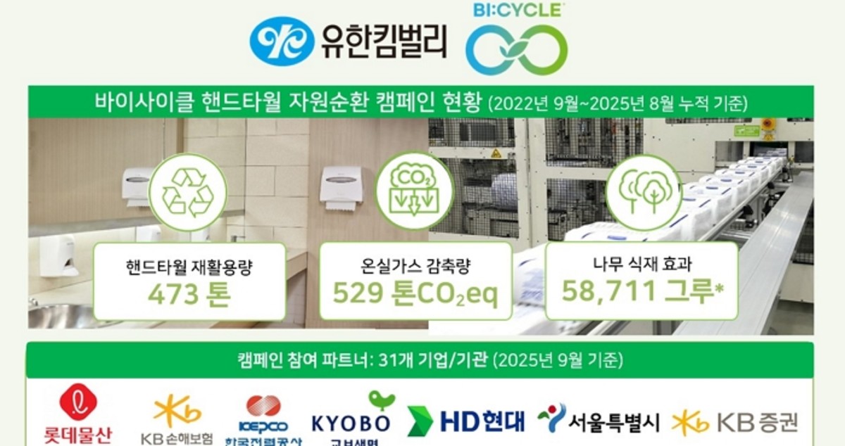 유한킴벌리가 핸드타월 자원순환 사업 '바이사이클' 캠페인을 통해 누적 500톤의 온실가스 저감 효과를 달성했습니다. 이는 지난 2022년 9월 사업을 본격화한 지 3년 만에 이룬 성과로, 핸드타월 자원순환의 환경적 가치를 입증하는 결과입니다.