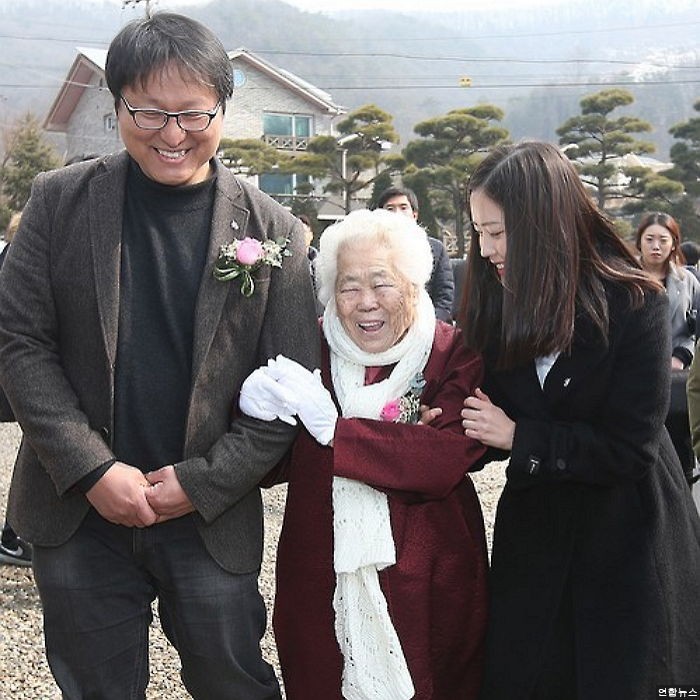 얼굴에도 웃음꽃이 활짝 핀 이 할머니의 팔짱을 끼고 이동하는 두 여배우의 따뜻한 모습은 보는 이의 미소를 자아내게 한다.