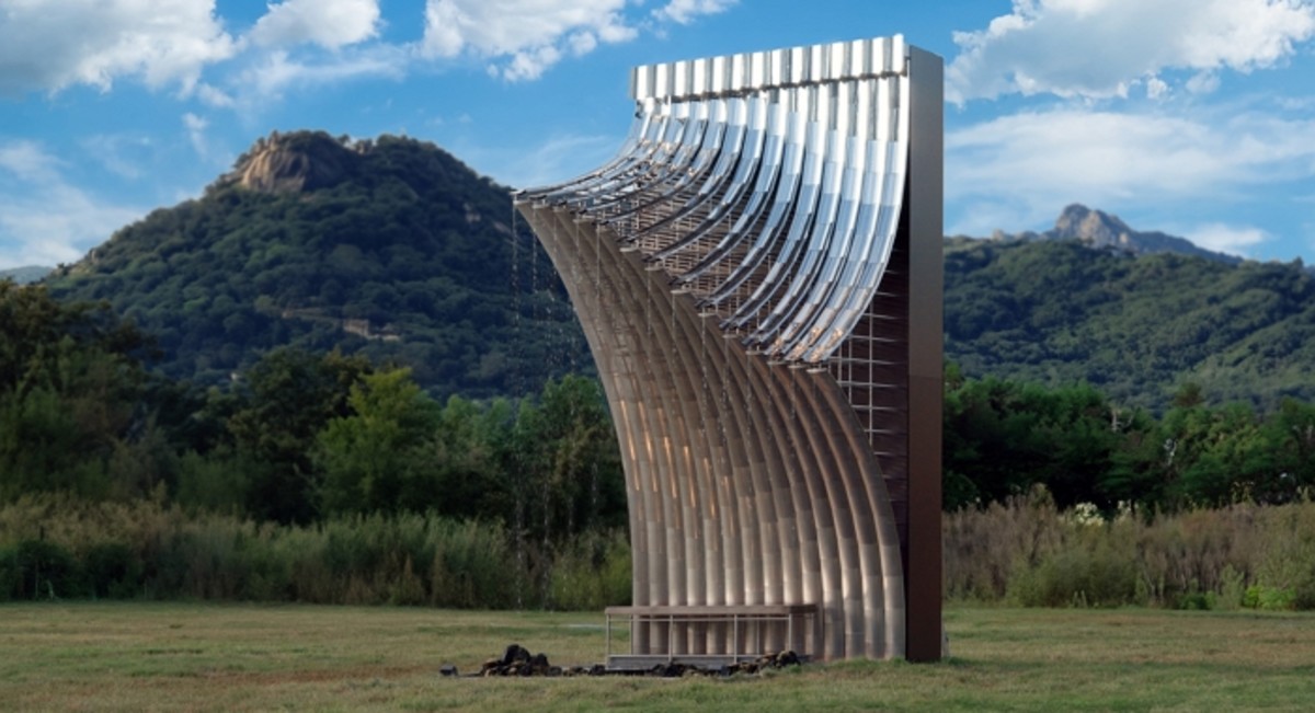 산 능선을 닮은 처마와 기와를 따라 흐르는 물을 감상할 수 있는 벤치가 마련되어 있어, 관람객들은 앉아서 휴식을 취하며 물의 흐름을 감상할 수 있습니다.