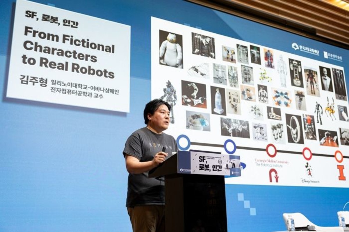 첫 번째 발표자인 김주형 미국 일리노이대 어바나-샴페인 교수는 디즈니리서치, 카네기멜런대 로보틱스 연구소, 삼성전자 등에서의 경험을 바탕으로 애니메이션 캐릭터를 실제 로봇으로 구현하는 과정을 소개했습니다.