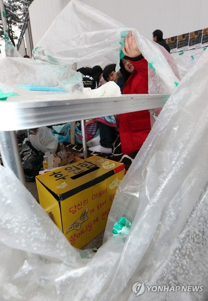 막바지 추위가 기승을 부리는 날씨에도 소녀상지킴이 회원들은 여전히 노숙농성을 이어가고 있다.