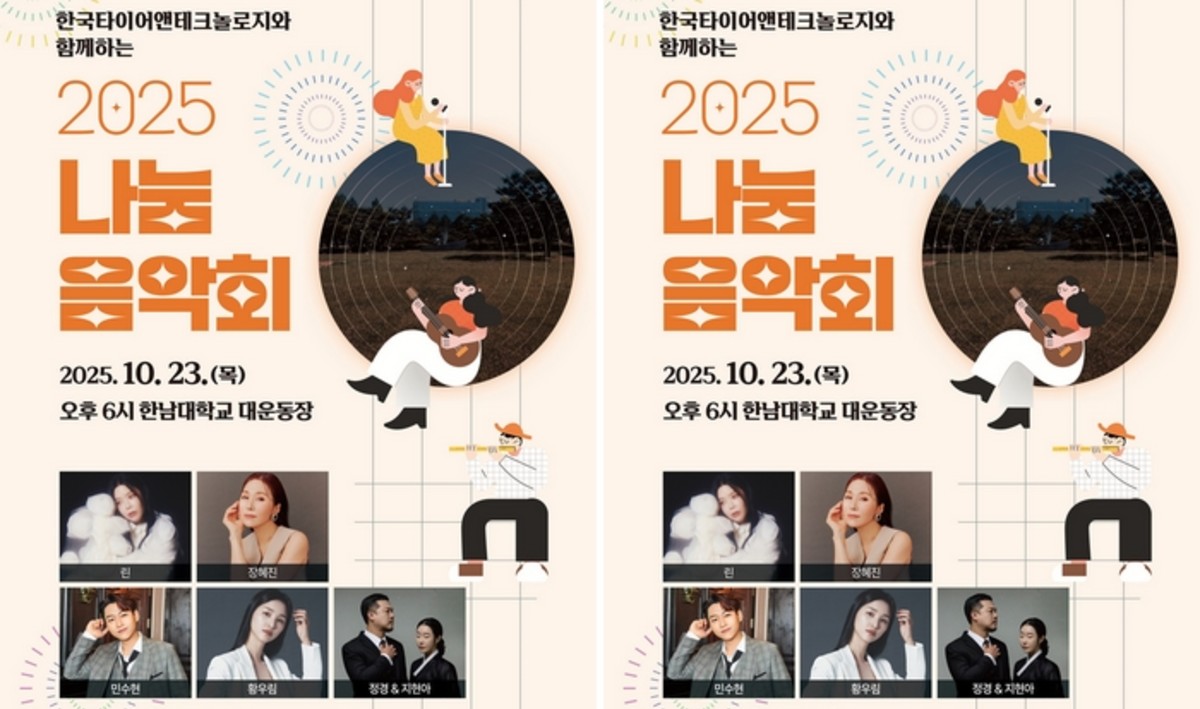 한국타이어앤테크놀로지가 오는 10월 23일 오후 6시 대전시 대덕구 한남대학교 대운동장에서 '2025 나눔음악회'를 개최한다고 발표했습니다.