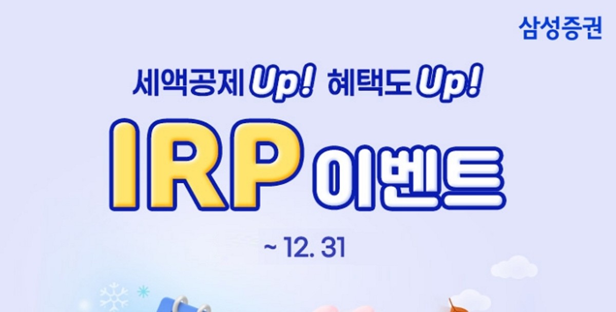 한편, 삼성증권은 IRP에 대한 관심을 높이고 연금 고객에게 실질적인 혜택을 제공하고자 '세액공제 Up! 혜택도 Up! Hurry Up! IRP 이벤트'를 오는 12월 31일까지 진행합니다.