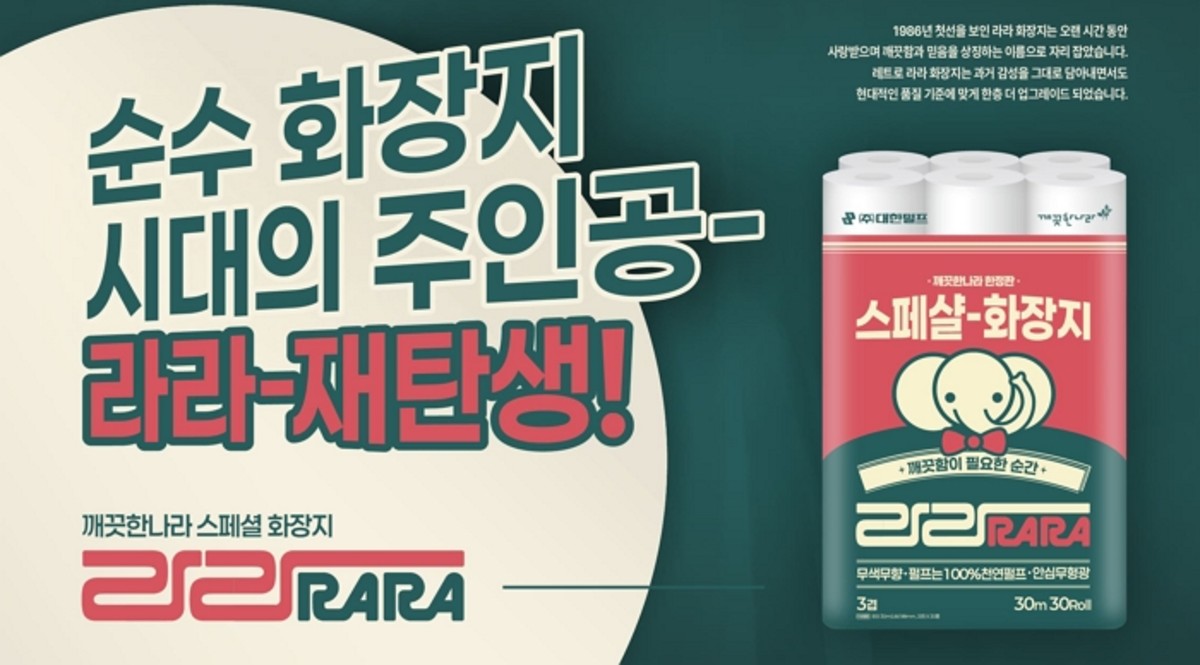 생활 혁신 솔루션 전문기업 깨끗한나라가 23일 1980년대 국내를 대표했던 화장지 브랜드 '라라 화장지'의 부활을 공식 발표했습니다.