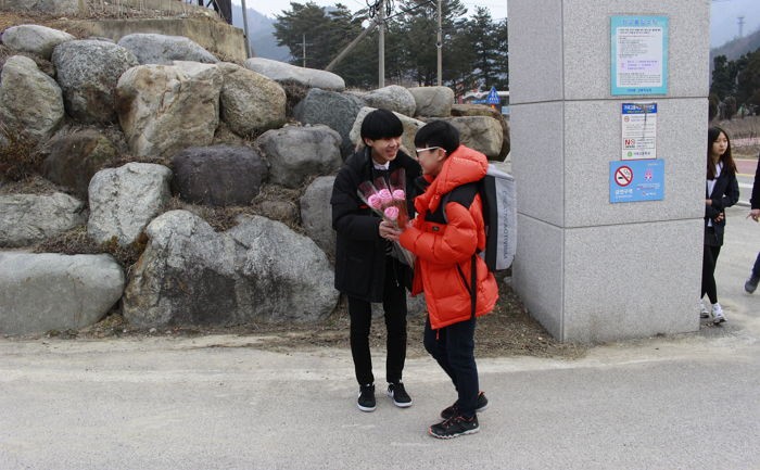 가곡중학교 교사들과 선배들 그리고 자신의 입학을 축하하기 위해 모인 지역 주민들을 볼 수 있었기 때문이다. 이들은 양쪽에 서서 입학 축하 노래를 불러줬다.