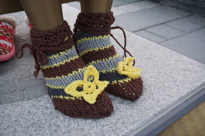 이곳 자원봉사자에 의하면 소녀상의 차가운 맨발이 안쓰러웠던 누군가가 밤새 한코 한코 뜨개질을 해서 양말을 신겨 주고 신발까지 두고 갔다고 한다.