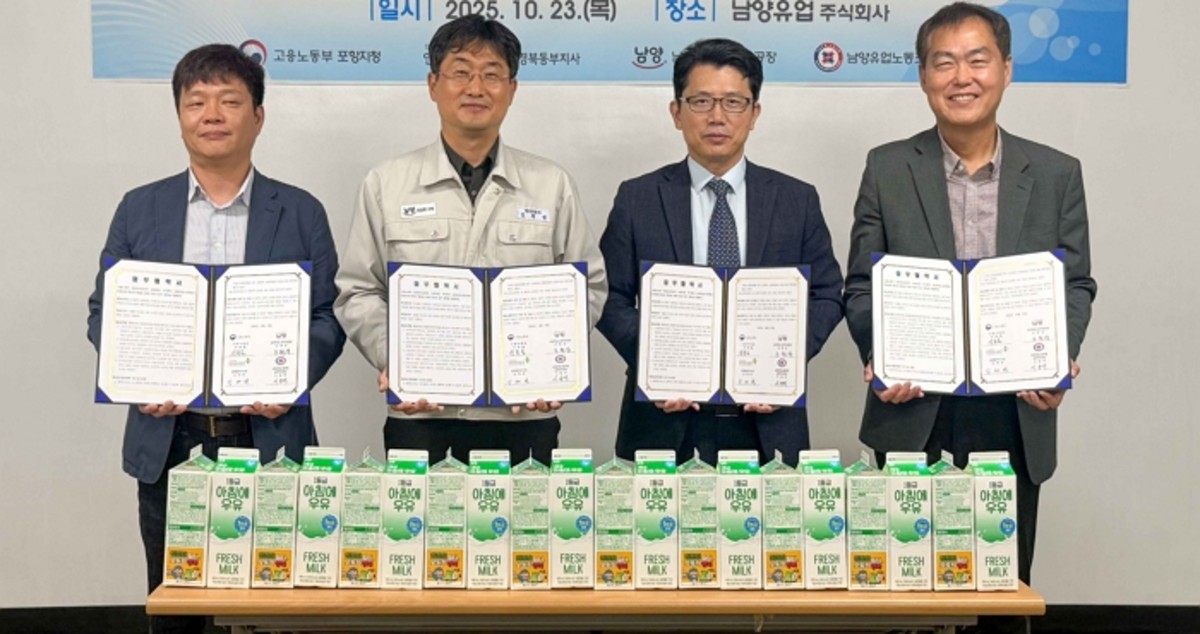협약식에는 신동술 고용노동부 포항지청장, 김태완 한국산업안전보건공단 경북동부지사장, 조현상 남양유업 경주공장장, 이동백 남양유업노동조합 경주부지부장이 참석했습니다. 특히 노·사·정이 한자리에 모여 현장 안전문화 정착과 안전한 일터 조성에 공동으로 나선다는 점에서 주목받고 있습니다.