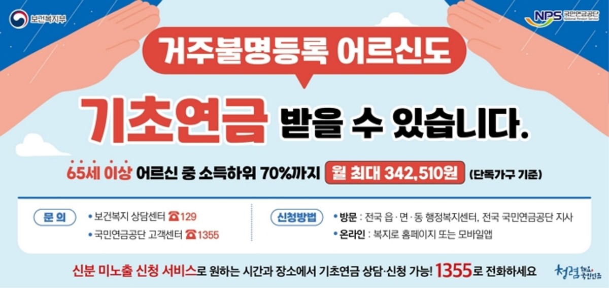 기초연금 제도는 거주불명 등록 상태에서도 국내에 거주하는 만 65세 이상 국민이라면 누구나 신청이 가능합니다.