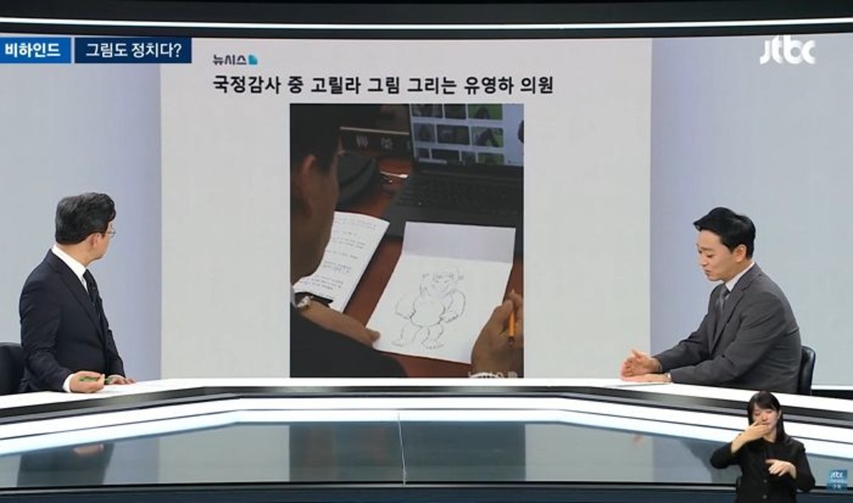 국정감사 현장에서 고릴라 그림을 그리는 국민의힘 유영하 의원의 모습이 화제가 되고 있습니다.