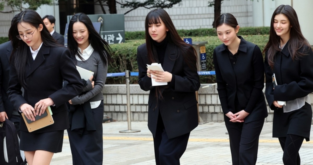 그룹 뉴진스(왼쪽부터 민지, 하니, 혜인, 해린, 다니엘)가 7일 서울 서초구 서울중앙지방법원에서 어도어 측이 멤버들을 상대로 제기한 ‘기획사 지위보전 및 광고계약 체결 등 금지’ 가처분 첫 심문기일을 마친 후 법원을 나서고 있다. 2025.3.7 / 뉴스1