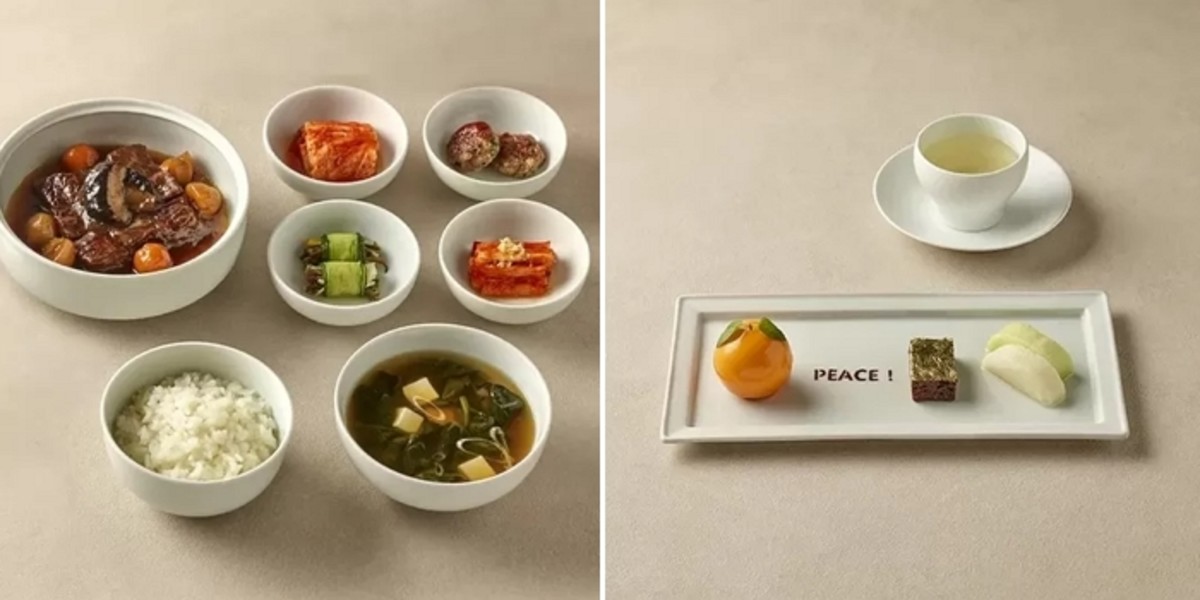 만찬 메뉴로는 영월 오골계, 트러플을 곁들인 만두, 경주 천년 한우 등심, 구룡포 광어, 지리산 청정 지역에서 양식된 캐비아를 곁들인 최고급 양식 코스 요리가 준비되었습니다.