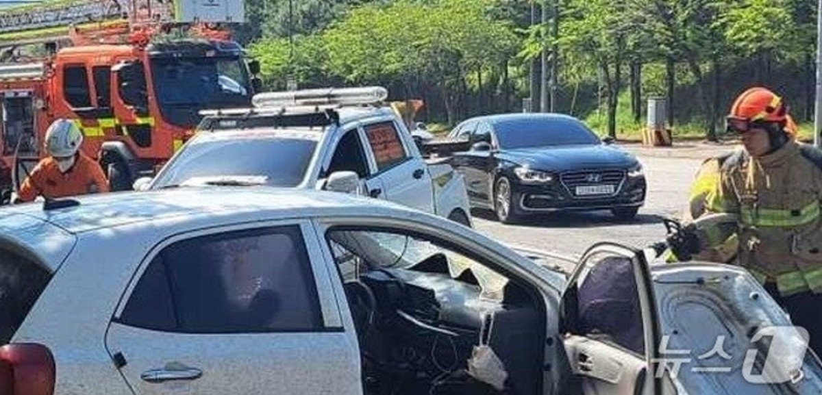 지난 4월 29일 오전 9시 29분쯤 강원 원주시 한 도로에서 '제네시스' 차량과 모닝 차량이 충돌하는 사고가 발생한 가운데, 모닝 차량 운전자인 30대 남성이 병원으로 옮겨졌지만 끝내 숨졌다. (강원도소방본부 제공. 재판매 및 DB금지) 2025.10.31/뉴스1