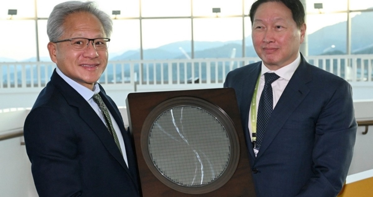 젠슨 황 엔비디아 CEO가 31일 경북 경주시 경주예술의전당에서 열린 아시아태평양경제협력체(APEC) CEO 서밋에 참석해 최태원 SK그룹 회장 겸 대한상의 회장으로 부터 SK하이닉스의 HBM4 반도체 웨이퍼를 선물로 받고 있다. 2025.10.31 / 뉴스1