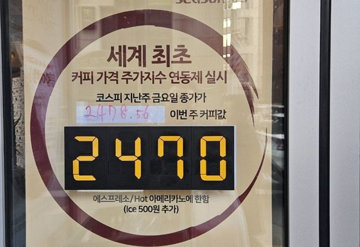 지난 2일 한 온라인 커뮤니티를 통해 해당 카페의 최신 근황이 공개됐습니다. 공개된 사진에 따르면 코스피 지수 4000선 돌파를 코 앞에 둔 지난달 24일, 사장님은 이날 종가였던 3941.59를 커피값에 연동하지 않았습니다.