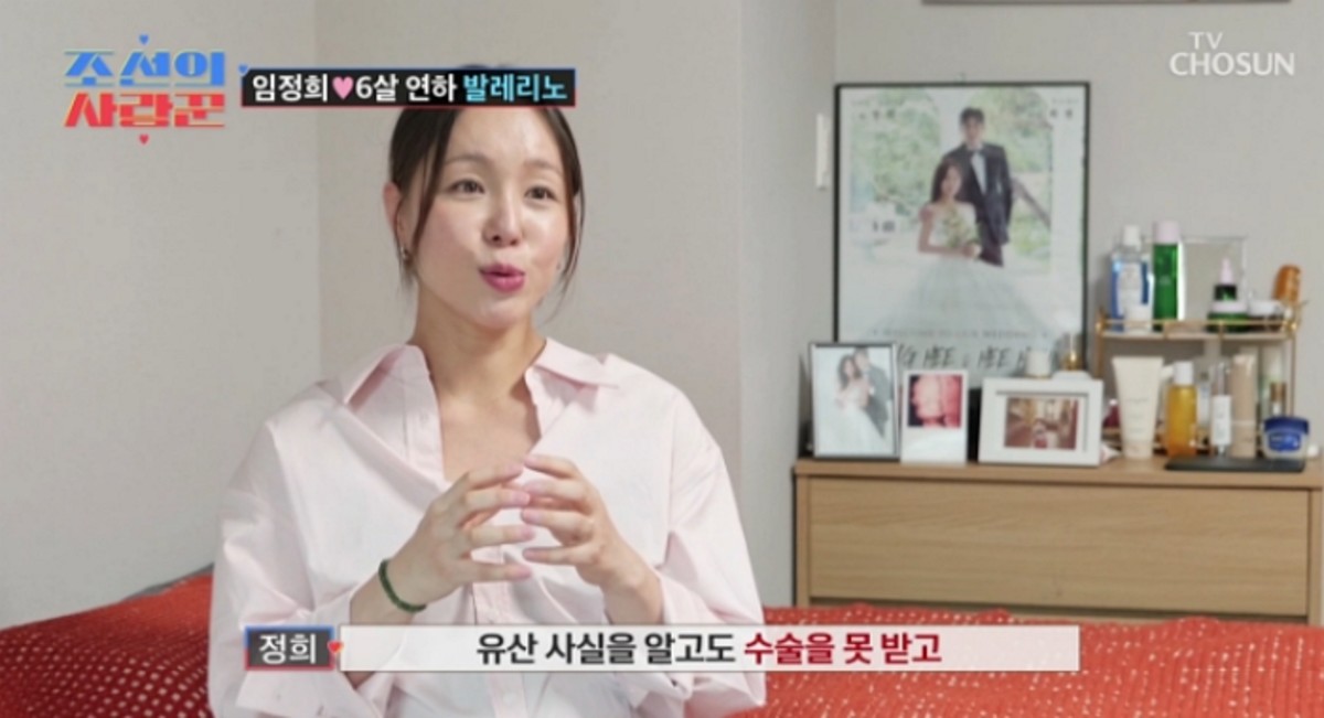 임정희는 "결혼하자마자 자연임신으로 아기가 한 번 생겼었는데 8주 전에 안 좋은 일이 있었다"며 과거 유산 사실을 털어놨습니다. 그는 "그래서 8주까지가 조마조마했다"고 현재 임신에 대한 불안감을 드러냈습니다.