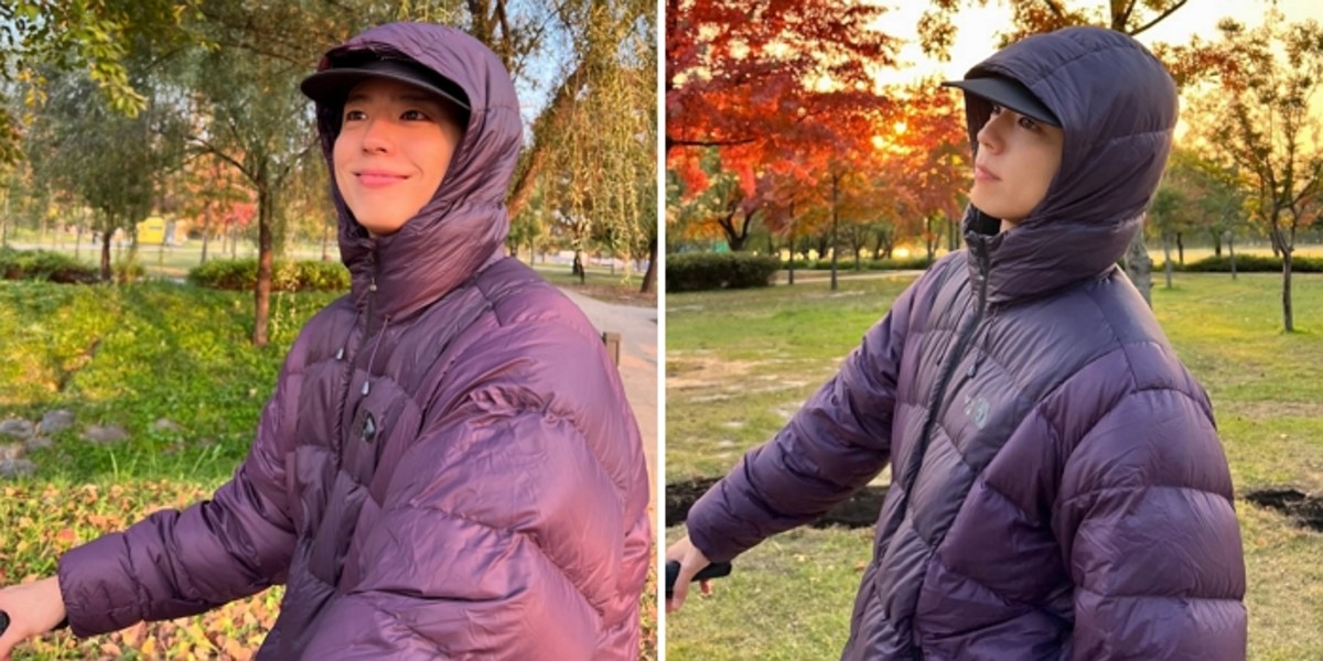 게시된 사진에는 박보검이 보라색 패딩을 착용한 채 자전거를 타며 가을 풍경을 만끽하는 모습이 담겨 있습니다.