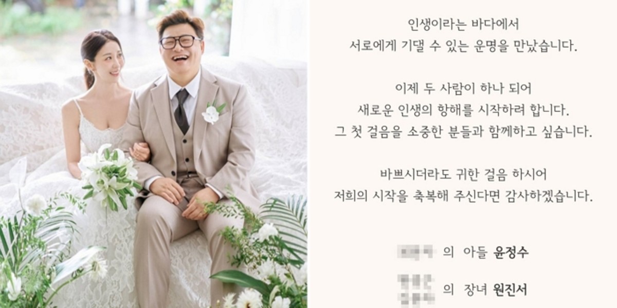 공개된 청첩장에는 "결혼합니다. 인생이라는 바다에서 서로에게 기댈 수 있는 운명을 만났습니다. 이제 두 사람이 하나 되어 새로운 인생의 항해를 시작하려 합니다. 그 첫 걸음을 소중한 분들과 함께하고 싶습니다. 바쁘시더라도 귀한 걸음 하시어 저희의 시작을 축복해 주신다면 감사하겠습니다"라는 진심 어린 메시지가 담겨 있습니다.