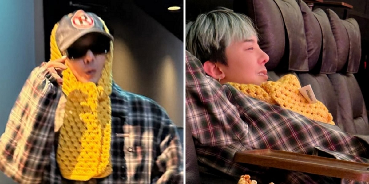 사진에서 지드래곤은 체크 패턴 셔츠를 베이스로 한 코디네이션에 강렬한 노란색 니트 목도리를 포인트 아이템으로 활용해 시선을 사로잡았습니다.