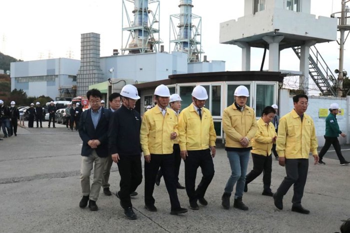정청래 더불어민주당 당대표(앞줄 왼쪽에서 두번째)가 7일 한국동서발전 울산화력발전소 붕괴 사고 현장에서 이동하고 있다.2025.11.7 / 뉴스1