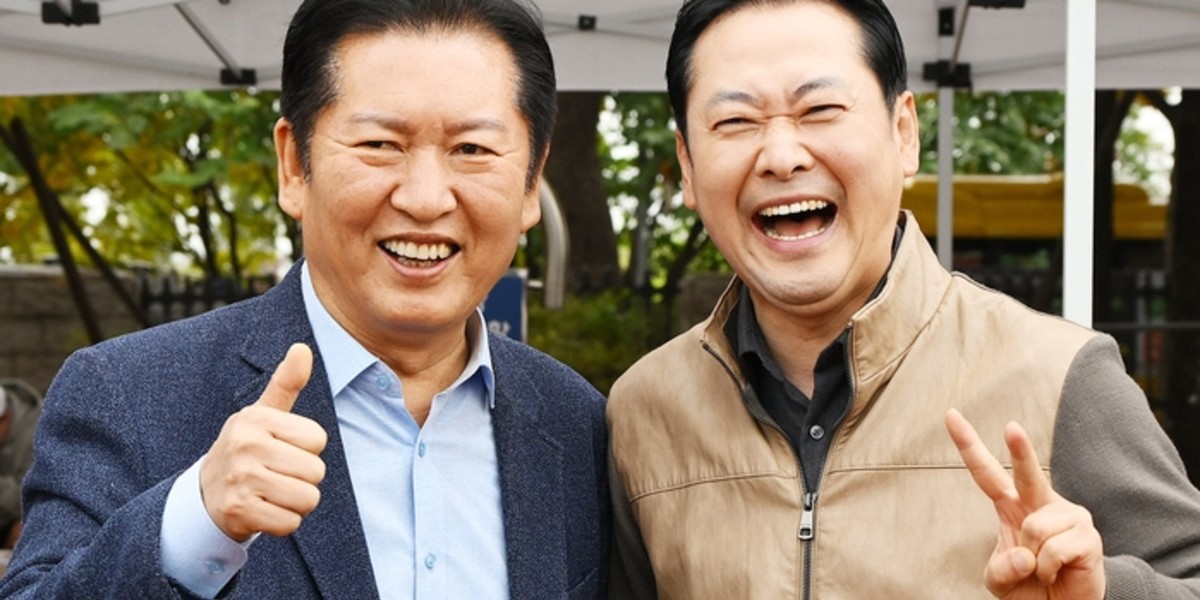 악수 후 환한 웃음을 지으며 기념촬영을 하는 모습이 포착됐습니다. 정청래 대표는 엄지손가락을 치켜세웠고, 장동혁 대표는 검지와 중지를 펼쳐 V자를 그리며 포즈를 취했습니다.