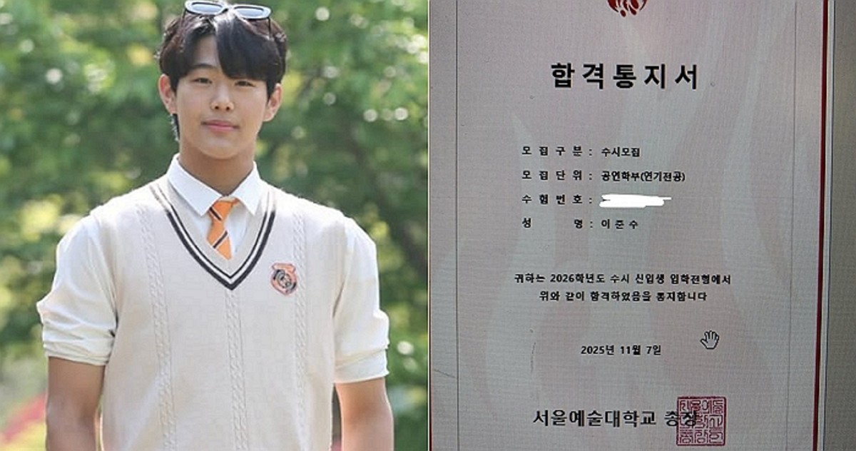 공개된 사진에는 이준수의 서울예술대학교 합격통지서가 포함되어 있어 눈길을 끌었습니다. 이준수는 서울예술대학교 공연학부 연기전공에 수시 모집으로 최종 합격했습니다.