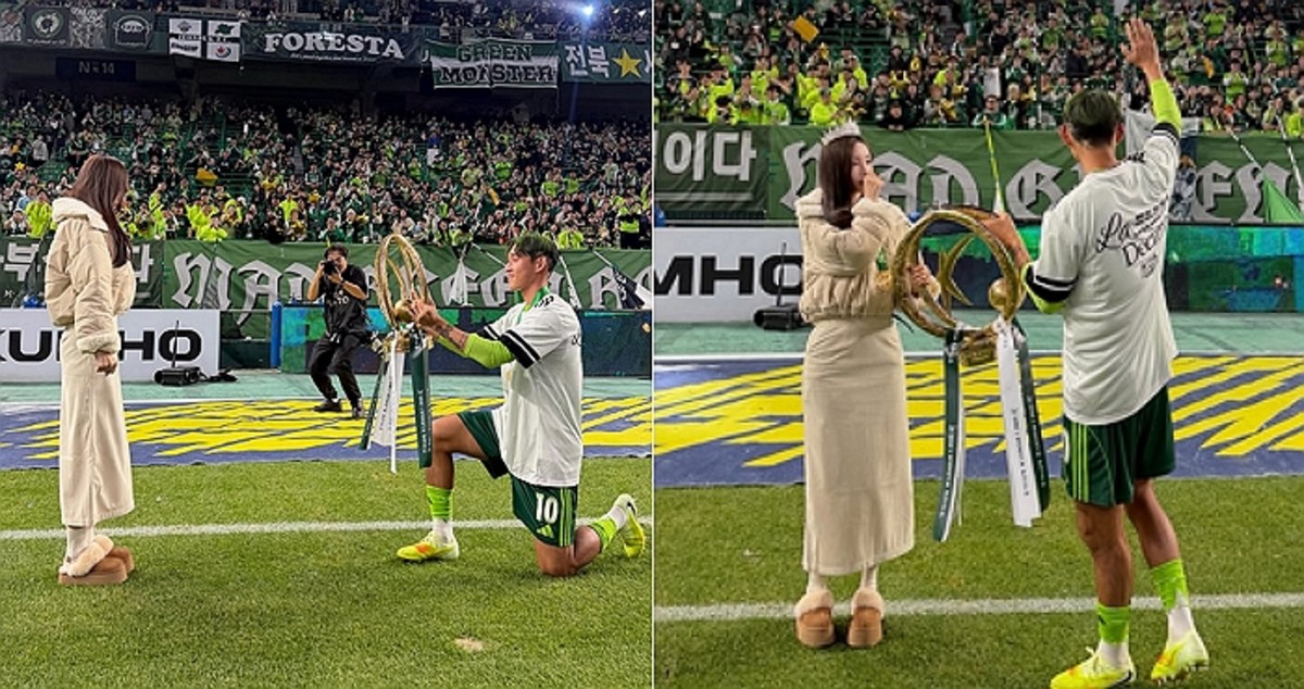 공개된 사진에는 전북 현대 송민규가 경기 후 곽민선에게 우승 트로피를 건네며 프러포즈하는 모습이 담겨 있습니다. 곽민선은 손으로 얼굴을 가리며 기쁨을 감추지 못하는 모습을 보였습니다.
