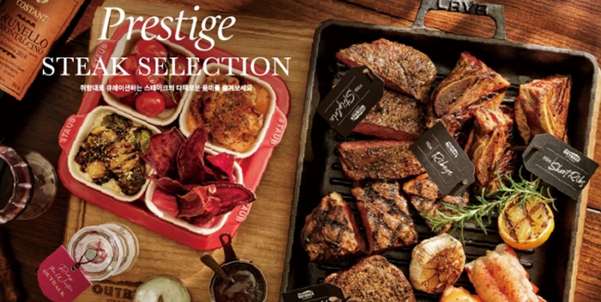 프레스티지 스테이크 셀렉션은 꽃등심 스테이크와 탱글탱글한 랍스터 테일 2개를 함께 제공하며, 최상급 부위 4가지 중 3가지를 고객이 직접 선택할 수 있는 맞춤형 럭셔리 스테이크 컬렉션입니다.