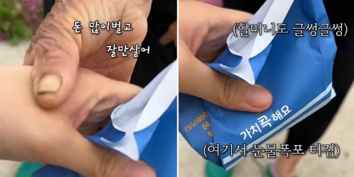 이에 유튜버가 장난스레 "한 8만원쯤 하지 않을까?"라고 답하자, 집으로 다녀오신 할머니는 돈봉투를 건네며 "돈 많이 벌고 잘만 살어"라고 했습니다.