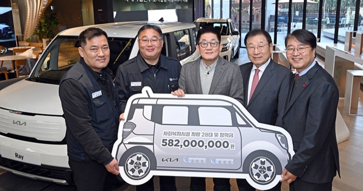 기아는 12일 국내사업본부 노사가 앞서 11일 서울 압구정 브랜드 체험관 'Kia360'에서 '2025년 노사 합동 사랑나누기' 기부 캠페인을 통해 차량 및 장학금 전달식을 개최했다고 발표했습니다.