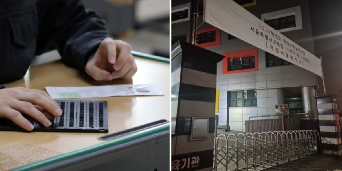 서울맹학교는 빛을 전혀 지각하지 못할 정도로 시각에 장애가 있어 점자로 시험을 치르는 전맹 학생들이 수능을 보는 고사장입니다. 확대경으로 시험을 치르는 저시력 장애인들은 여의도중학교에서 수능을 치렀습니다.