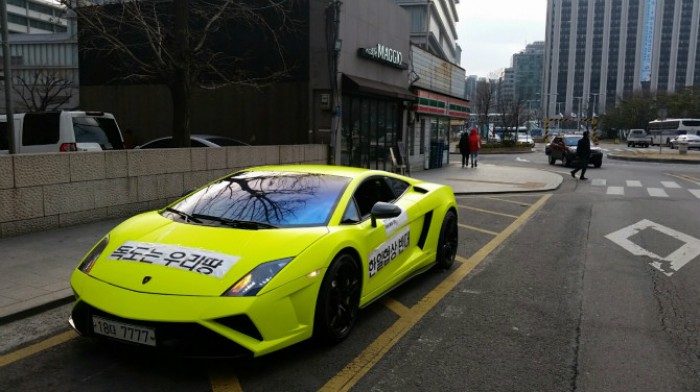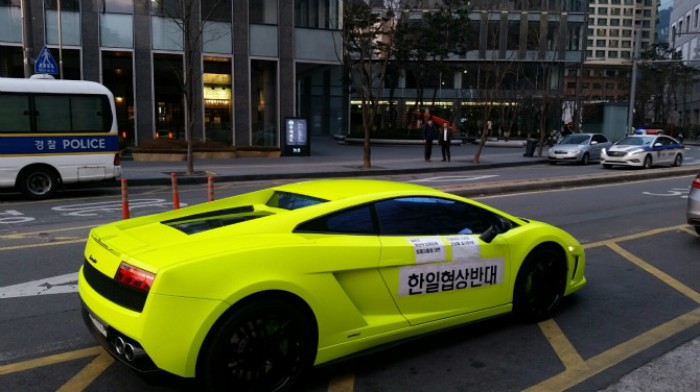 지난 1일 오후 5시경 서울 일본대사관 근처에는 "독도는 우리땅", "한일협상 반대" 등의 문구를 차량에 부착한 형광빛 람보르기니가 나타났다.