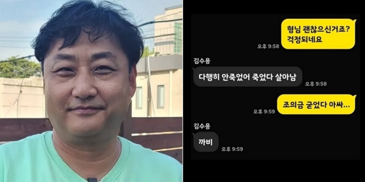 윤석주가 "형님 괜찮으신 거죠? 너무 걱정된다"며 걱정스러운 마음을 전하자, 김수용은 "다행히 안 죽었어. 죽었다 살아남"이라고 답변하며 자신만의 유머 감각을 잃지 않았습니다.