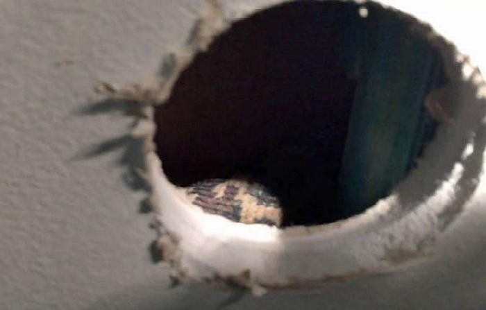 손전등을 이용해 벽에 뚫린 구멍 속을 환히 비추자 정체 불명의 물체가 숨는다.