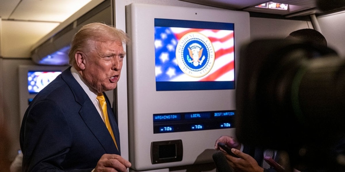 도널드 트럼프 미국 대통령이 2025년 11월 14일 워싱턴 DC에서 웨스트팜비치 국제공항으로 비행하는 동안 에어포스원에 탑승한 언론인들과 대화하고 있다 / GettyimagesKorea