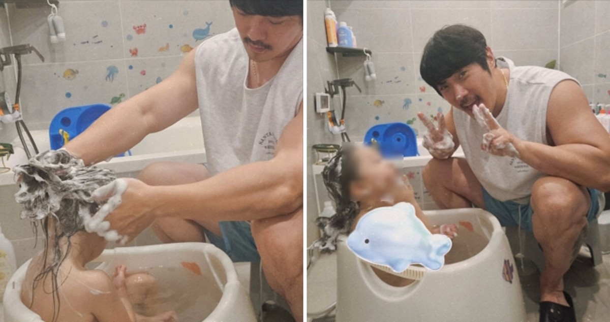 그는 "엄마가 씻기면 아프다고 늘 아빠만 찾는 우리 둘째"라는 설명과 함께 딸의 머리를 정성스럽게 감겨주는 모습을 담았습니다.