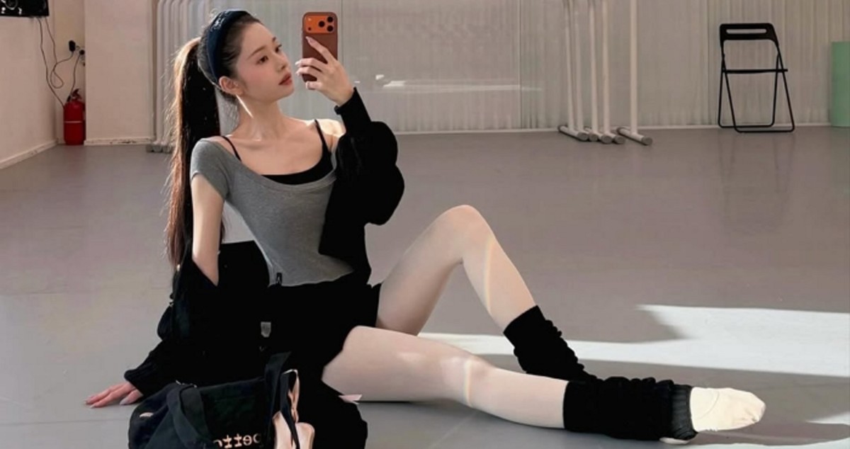 허리 부분에는 짧은 블랙 쇼츠를 매치해 실루엣을 강조했으며, 아이보리 톤 타이츠와 검은색 레그워머, 발레 슈즈로 전문적인 연습복 차림을 선보였습니다.