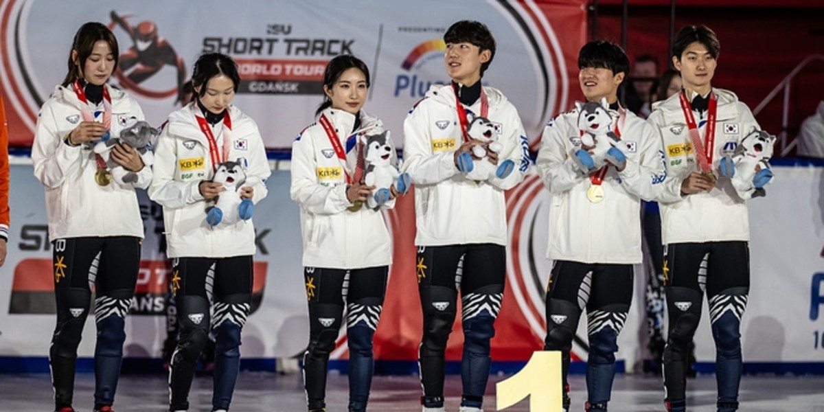 11월 23일 폴란드 그단스크의 할라 올리비아에서 열린 ISU 쇼트트랙 월드 투어 - 그단스크 2000m 혼성팀 릴레이 파이널 A 레이스 메달 수여식 후 축하하는 대한민국 대표팀 / GettyimagesKorea