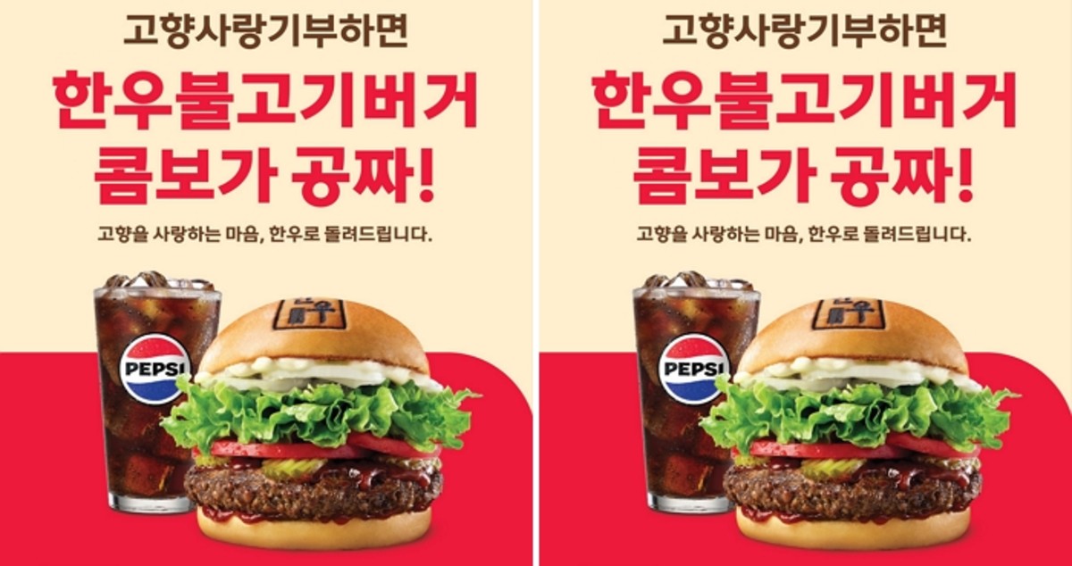 10만 원 이상의 고향사랑기부금을 기부하면 10,200원 상당의 '한우불고기버거' 콤보 모바일 쿠폰을 증정합니다