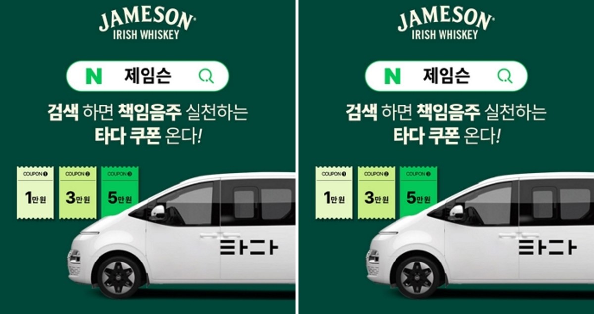 참여 방법은 네이버에서 '제임슨'을 검색한 후 책임음주 서약에 참여하는 것으로, 선착순 600명에게는 연말 책임음주 실천을 장려하는 차원에서 '타다 택시' 쿠폰이 제공됩니다.