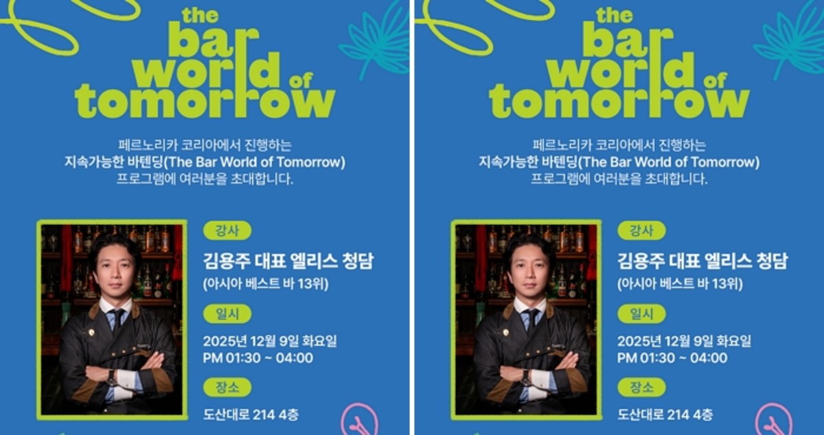 글로벌 주류 대기업 페르노리카 그룹의 국내 법인 주식회사 페르노리카코리아가 오는 12월 9일 아시아 베스트 바 13위로 선정된 앨리스 청담의 김용주 대표와 협력하여 지속가능한 바텐딩 프로그램의 심화 교육과정인 'T-Talk' 특강을 개최한다고 발표했습니다.