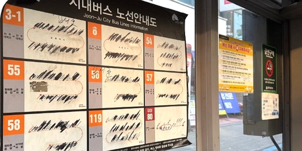 경찰에 따르면 A군을 포함한 10대 2명은 지난 22일 오후 11시경 전주시 덕진구 인후동에 위치한 시내버스 정류장 2곳에서 노선안내도를 검정 펜으로 낙서해 행선지 정보를 가리거나, 가장자리 부분을 떼어내는 등 시설물을 훼손한 후 현장을 이탈한 혐의를 받고 있습니다.