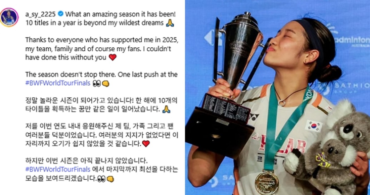 배드민턴 여자 단식 세계 1위 안세영이 시즌 10관왕이라는 전무후무한 기록을 달성한 후 소셜미디어를 통해 팬들과 소감을 나누며 깊은 감사의 마음을 표현했습니다.