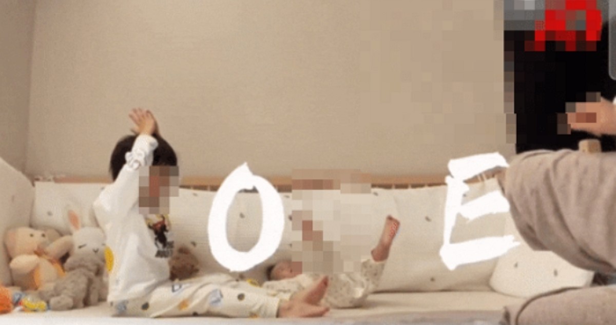 해당 영상에는 한 여성이 가정집에서 'LOVE'라는 글자를 만들기 위해 두 아이를 이용하는 모습이 담겨 있습니다.