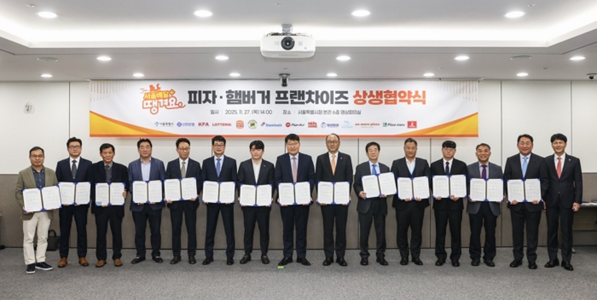 지난 27일 서울시청 6층 영상회의실에서 열린 이번 협약식에는 김태균 서울시 행정1부시장을 비롯해 김기흥 신한은행 부행장, 강석우 한국프랜차이즈산업협회 상근부회장이 참석했습니다.