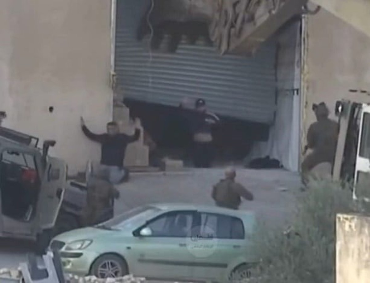 이스라엘군이 건물에서 나온 팔레스타인 비무장 남성 2명을 포위한 모습 / X(옛 트위터)