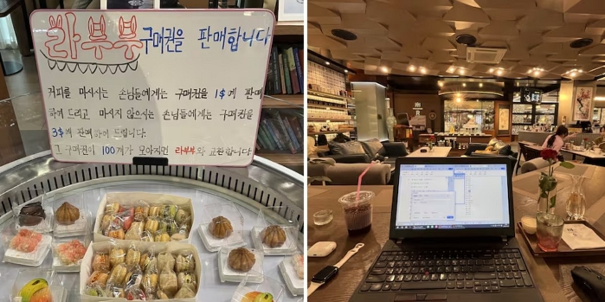 샐리인이 게시한 사진 속 안내판에는 "라부부 구매권을 판매합니다"라는 문구와 함께 구체적인 판매 방식이 설명되어 있습니다. 커피를 주문하는 고객에게는 구매권을 1달러(약 1469원)에, 음료를 주문하지 않는 고객에게는 3달러(약 4407원)에 판매한다고 명시되어 있습니다. 이 구매권 100개를 모으면 라부부 피규어 1개와 교환할 수 있다는 내용도 포함되어 있습니다.