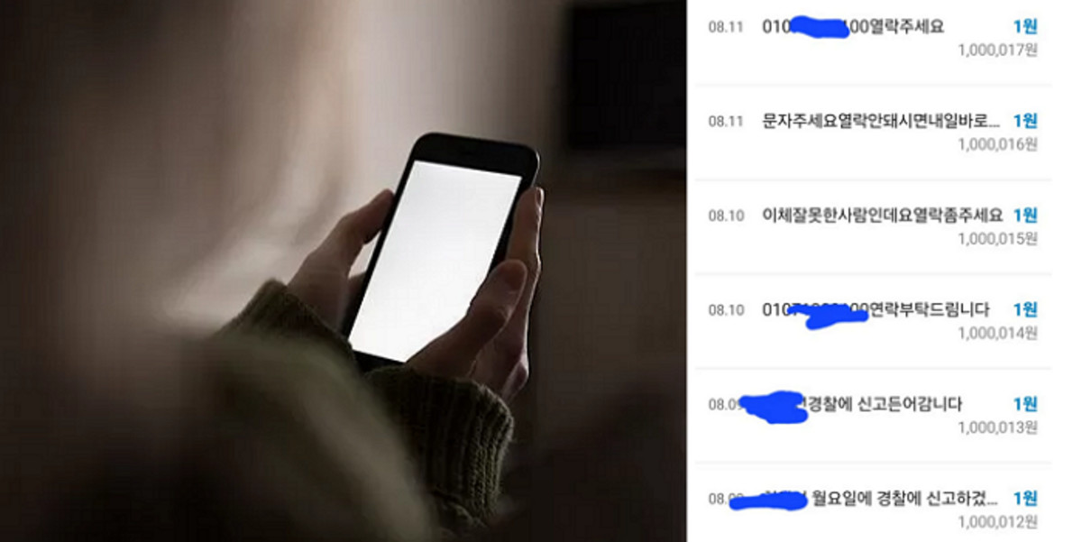 A씨는 이후 3일간 1원씩 송금하면서 "월요일에 경찰에 신고하겠다", "이 번호로 연락 부탁드립니다", "문자 안보내면 바로 신고하겠다" 등의 메시지를 지속적으로 전송했습니다.