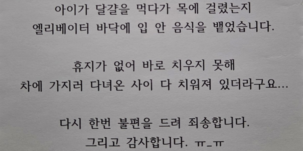 아이가 실수로 엘리베이터에 뱉은 음식물을 누군가 말없이 치워준 일과 이에 대한 진심 어린 감사 인사가 주민들 사이에서 훈훈한 감동을 전하고 있습니다.