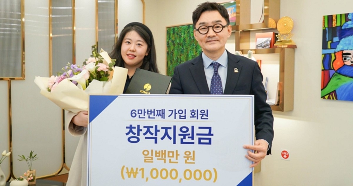 서울특별시 강서구 음저협 본사에서 열린 기념식에서 추가열 회장은 6만 번째 회원인 송혜교 씨에게 직접 창작지원금 100만 원을 전달했습니다.