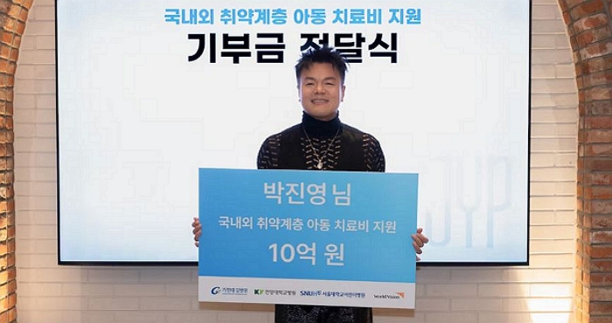 박진영은 고액의 수술비와 치료비로 어려움을 겪는 취약계층 환아들을 돕기 위해 올해도 10억 원을 쾌척했습니다. 이번 기부금은 가천대 길병원, 건양대학교병원, 서울대학교 어린이병원에 각각 2억 원씩, 월드비전에 4억 원이 전달됩니다.